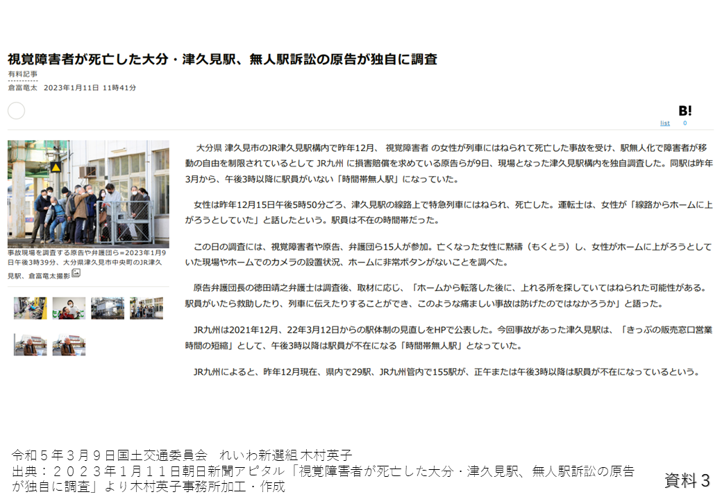 資料3をご覧ください。こうした中、2022年12月には、大分県の津久見駅で、駅員不在の時間帯に視覚障害者の方がホームから転落し、特急電車にはねられて亡くなりました。