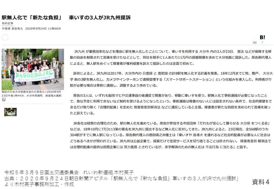 大分県ではずっと前から当事者団体の反対があり、資料4のとおり訴訟にもなっていますが、今回、無人駅でこのような痛ましい事故が起こってしまっています。