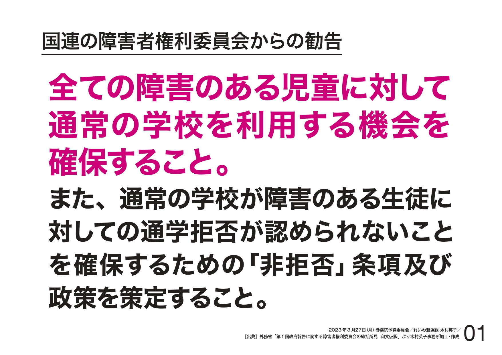 そして、昨年9月に障害者権利委員会から日本に対する総括所見が出され、(資料提示)資料1のとおり、全ての障害のある児童に対して通常の学校を利用する機会を確保するとあります。また、障害のあるお子さんの普通学校への就学を拒否してはいけないという非拒否条項を策定することが勧告されているところです。