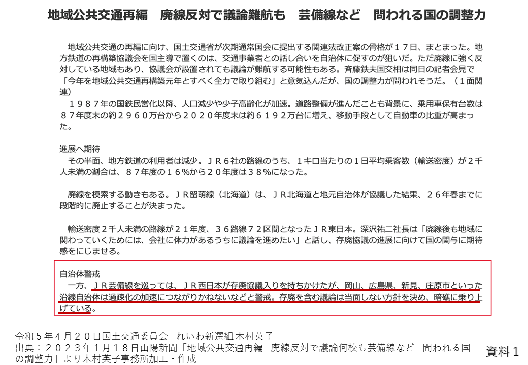 国交省は廃線ありきではないと言っていますけれども、公共交通機関は誰にとっても必要なインフラであり、特に合理的配慮とかが必要な障害者の方、高齢者の人たちの意見が反映されていないという今の現状を思うと、今回の法案は、赤字路線を廃線にし、重要な足である交通機関を奪い、また障害者や高齢者の移動の権利を脅かしているというふうに感じます。