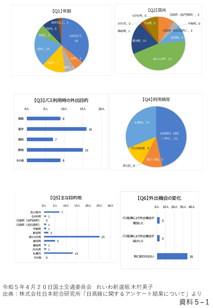 そして、実際に廃線された日高沿線にお住まいの人たち、障害者の方に直接聞き取りをしたところ、鉄道が廃線になってバスに転換されましたが、前日に予約しないと利用できなかったり、バスの便数が減っていて病院へ往復するにも何時間も掛かったり、また、車いす対応のタクシーも減ってしまい、病院に行くときには介護保険タクシーを使うようになりました。しかし、介護保険タクシーでは買物などには使えないため、大変不便になったと言っています。また、鉄道が廃線になる前は夜遅くまで電車があったので自宅から札幌に一泊二日で仕事に行くことができたそうですが、バスは本数が少なく、夜遅くの便はないために、結局札幌に仕事に行くのを諦めてしまうような状況になったと言っていました。鉄道がなくなったことが直接の原因かは分かりませんけれども、障害者の仲間が何人も札幌や苫小牧に引っ越してしまったと言っていました。今後、バスもなくなってしまうのではないかととても不安を感じていると言っていました。