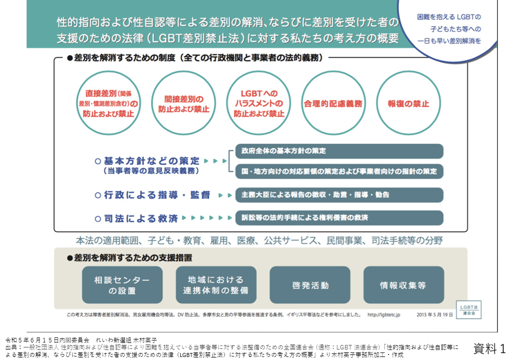 これは、2015年にLGBT法連合がLGBT差別禁止法に対する考え方を発表したものです。このように当事者団体からも差別禁止法が求められていましたけれども、2021年に超党派で議論が重ねられ、性的指向及び性自認の多様性に関する国民の理解の増進に関する法律案が作られ、その後も何度か見直しが重ねられてきました。しかし、本日、参議院で審議される法案は、与党と維新、国民民主が協議をして作られたものですが、当事者の方たちが求めていたものとは程遠いものとなっています。