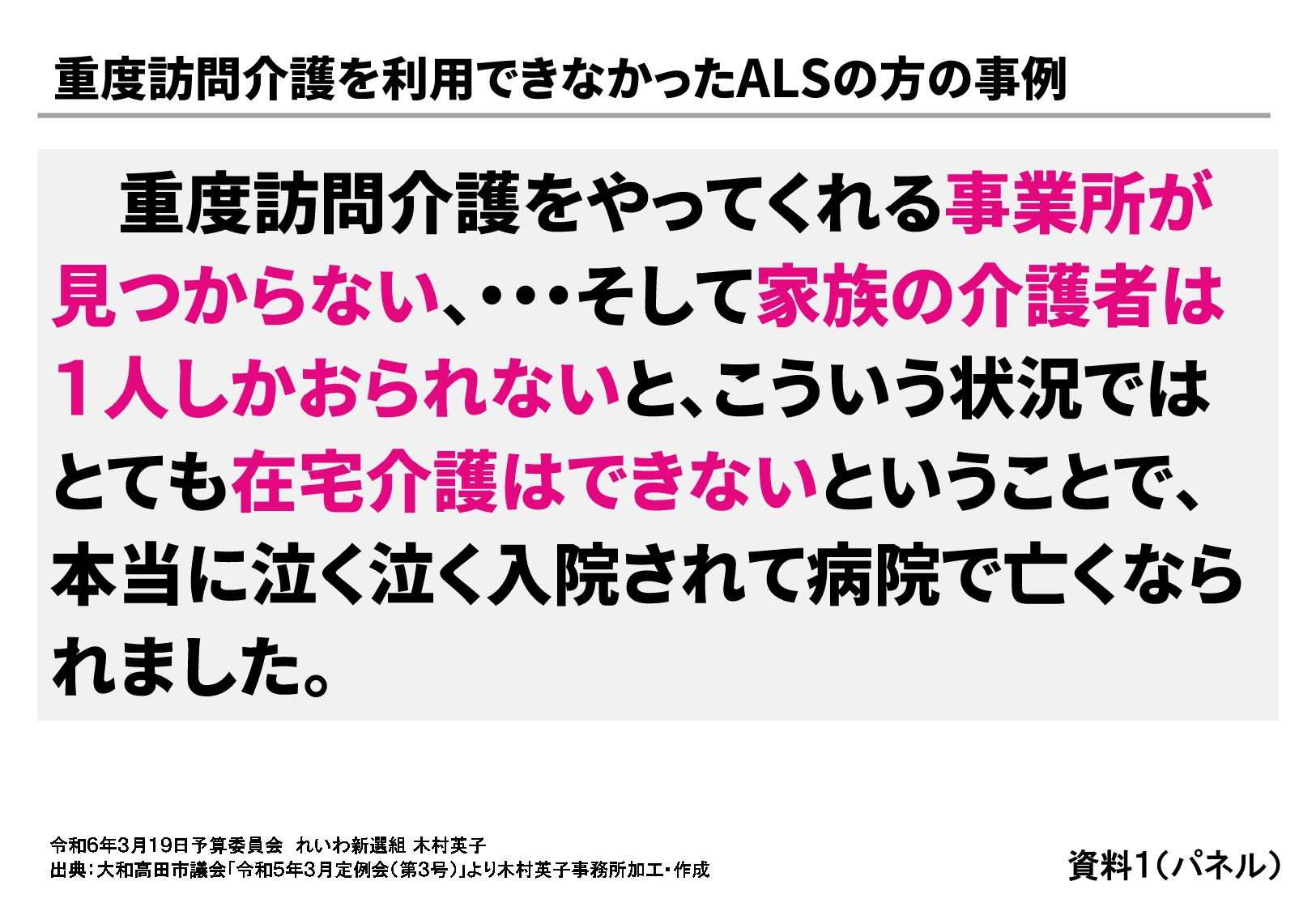 これは奈良県で重度訪問介護を利用できなかったALSの方の事例ですが、最後まで家族と一緒に自宅で生活したいと希望しても、派遣してくれる事業所が見つからず、泣く泣く入院して、そのまま亡くなられました。その方は、病気が進んで声を出すことすら難しくなっていた状態でも、絞るように声を出して、帰りたい、いつ帰れるとおっしゃっていたそうです。