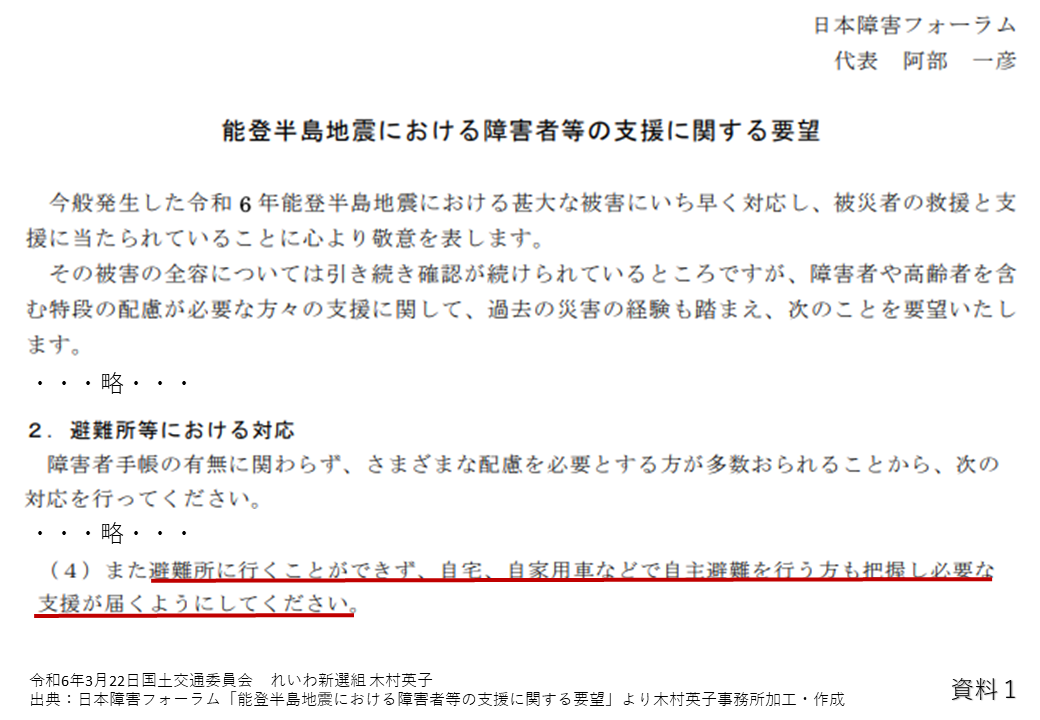 これはJDFという障害者団体から出された要望書ですが、今年1月に起きた能登半島地震について、避難所に行くことができず自宅、自家用車などで自主避難を行う方も把握し、必要な支援が届くようにしてくださいとの要望が出され、自宅で避難する人たちへの支援が障害当事者から強く求められています。