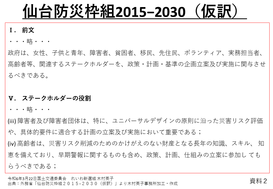 このように各自治体が防災会議に支援を要する当事者の参画を進めている背景には、資料2の、あるように、2015年の国連防災世界会議において取りまとめられた仙台防災枠組みの中で、防災について女性、障害者、高齢者などの当事者を政策、計画、基準の企画立案や実施に関与させるべきとして当事者の参画を促しているところにあります。