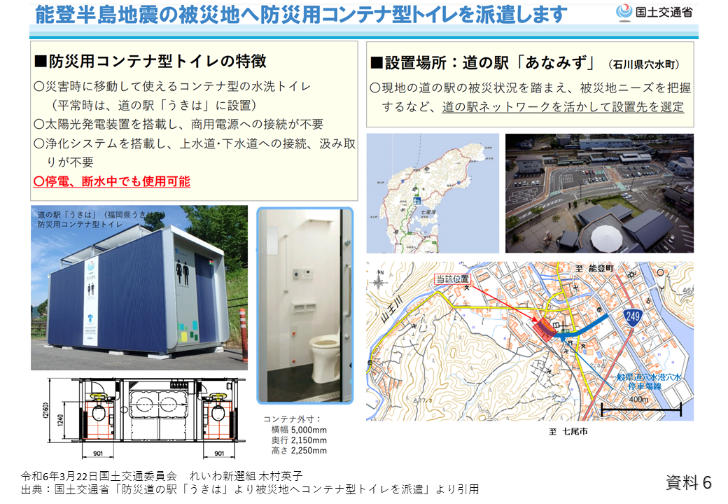 国土交通省におきましては、先ほど委員ご指摘のように、福岡県のうきは市にあります道の駅うきはから石川県の穴水町の道の駅あなみずに防災用コンテナ型のトイレを運んだところでございます。