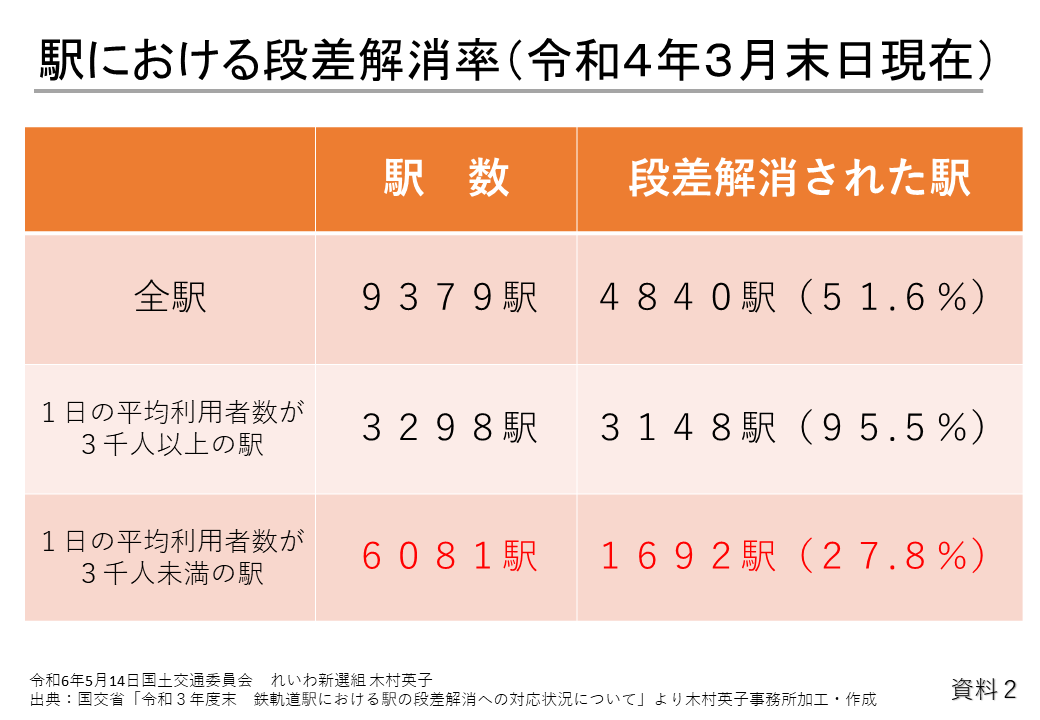 例えば、資料2のとおり、利用者数が3000人以上の駅については、エレベーターなどの設置が進んでおり、段差が解消されている駅は95%以上になっていますが、令和4年3月末時点で3000人未満の駅の段差解消率は約28%となっており、4分の1しかバリアフリー化されていません。そのため、地方においてはほとんどの駅がバリアフリー化されておりません。