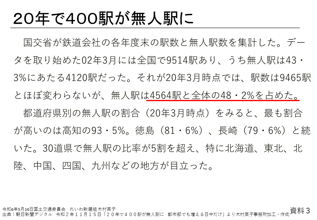 その上、資料3のとおり、人員削減によって無人駅が増え、2020年時点で全国の駅の約48%が無人駅となっており、支援の必要な障害者や高齢者にとっては安心して鉄道を利用できない状況になっています。