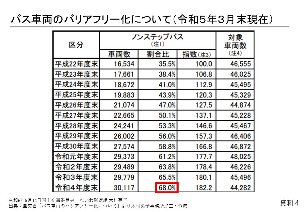 また、資料4のとおり、ノンステップバスの全国での普及率は2022年度末で約68%となっており、都市部のバスはほとんどノンステップバスとなっていますが、地域別に見ると、北海道は約45%、九州は約43%、北陸信越は53%と、まだまだ全国的にはノンステップバスが普及していない状況となっています。