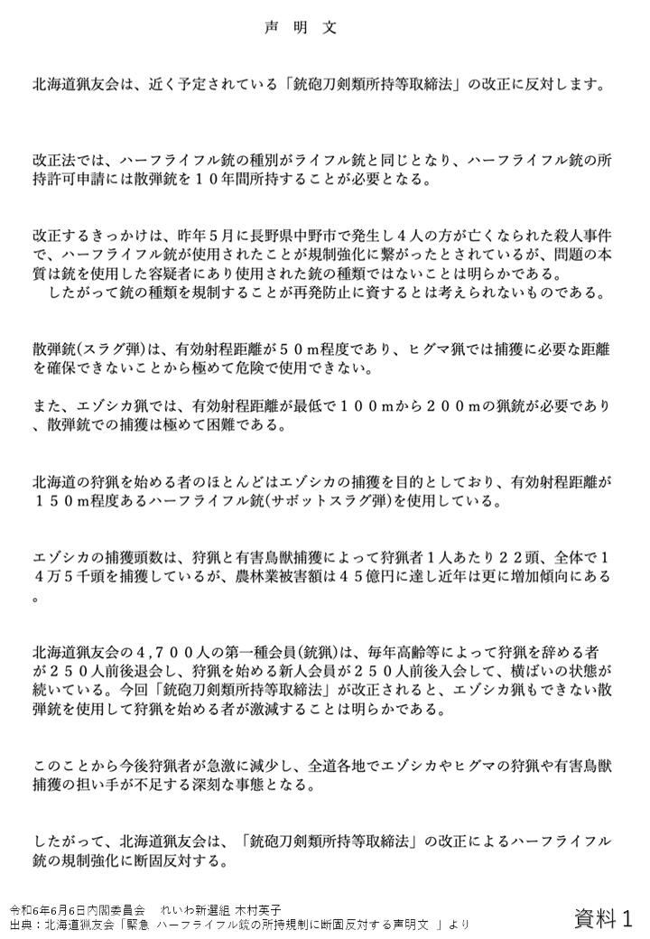 若手ハンターのほとんどがハーフライフル銃を使用しているため、北海道猟友会などの団体から、ハーフライフル銃の規制が厳しくなると将来的に若手ハンターの育成に重大な支障が出てしまうという懸念から、この改正案に反対の声明が出されています。