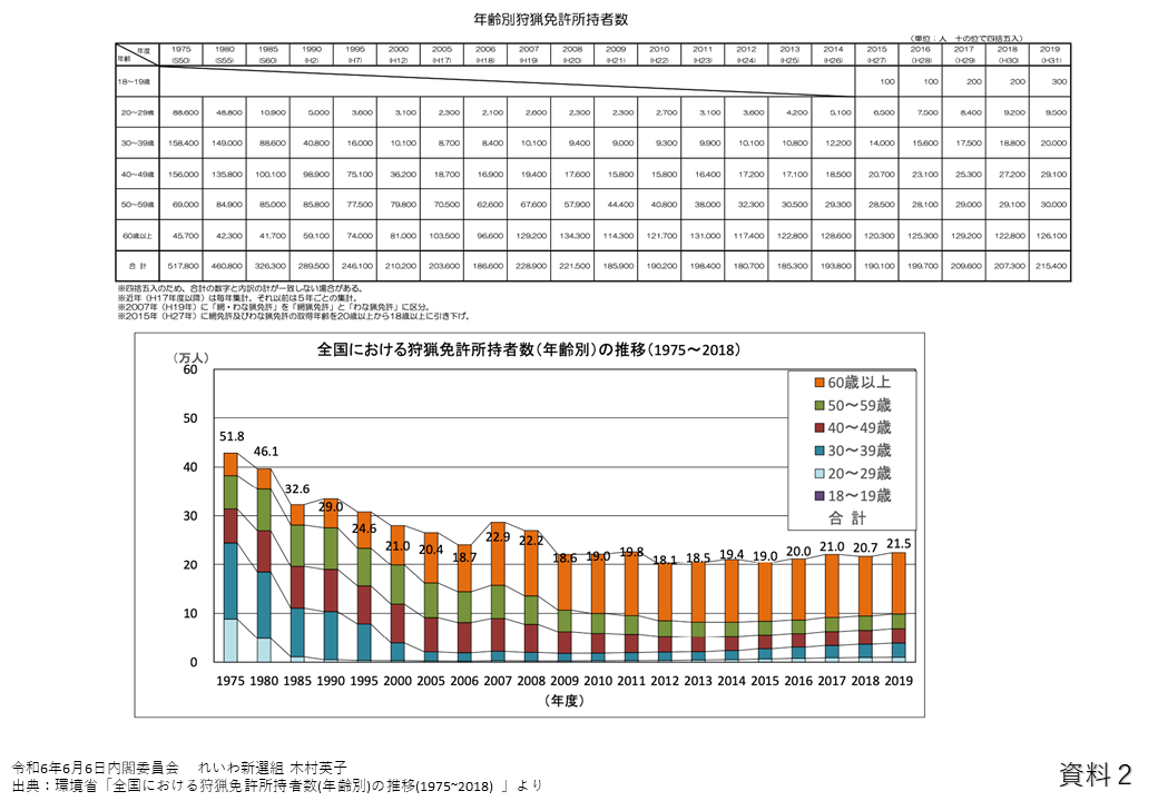 そのためにハンターの育成や資格取得者を増やす必要があると思いますけれども、資料2によれば、全国のハンターの数は、昭和50年から減少し続けており、微増ではあるものの、少子高齢化の影響もあり、若手ハンターの確保が喫緊の課題となっております。