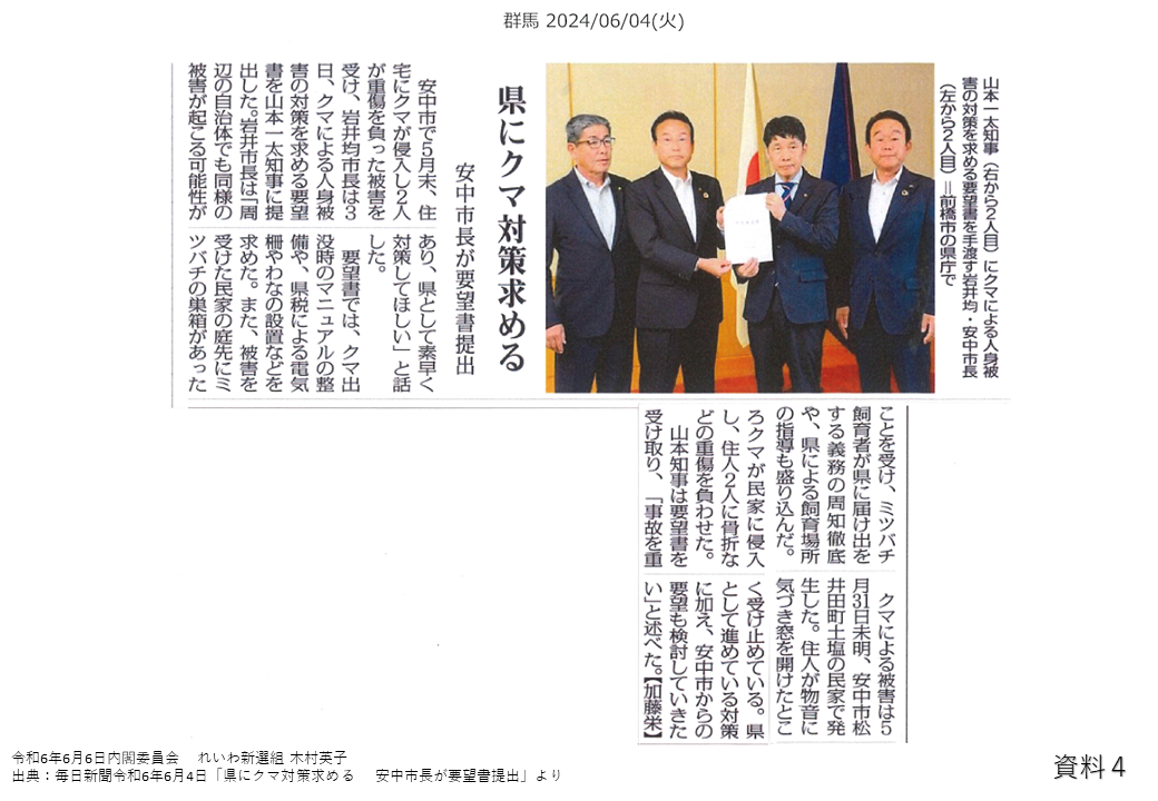 先ほどお話しした群馬県の安中市の事故の後、安中市長が群馬県知事に対し、電気柵や捕獲機材の整備についての支援などを要望しています。