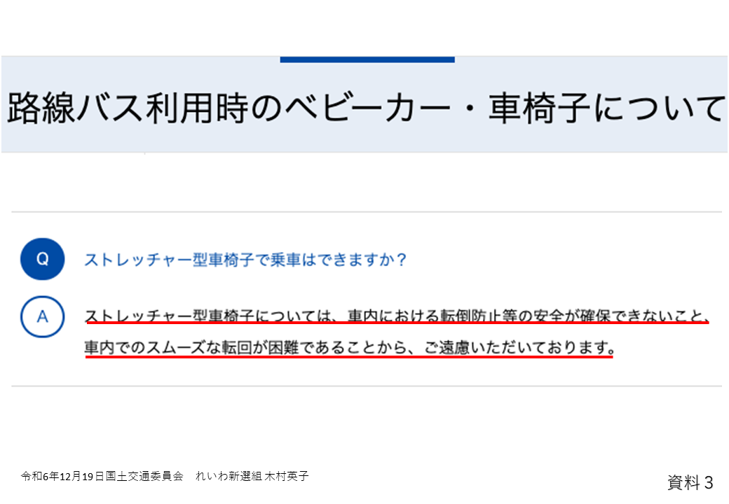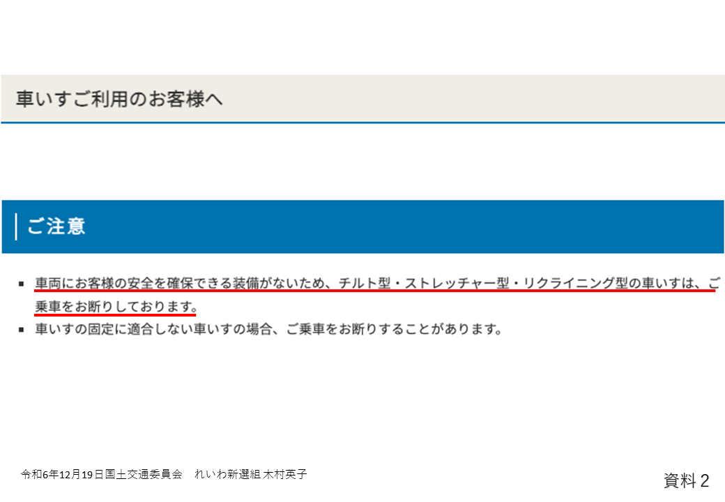 資料2のとおり、「車両にお客様の安全を確保できる装備がないため、チルト型、ストレッチャー型、リクライニング型の車いすはご乗車をお断りしております」といった記載がなされています。