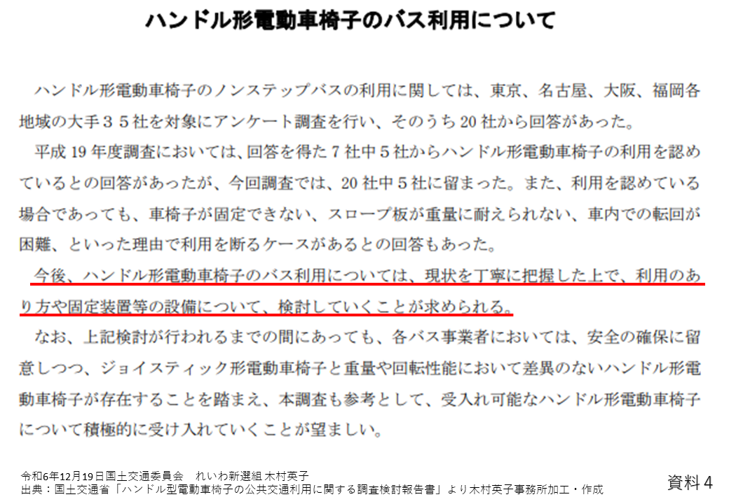 平成29年3月に国交省がまとめたハンドル型電動車椅子の公共交通利用に関する調査検討報告書において、「今後、ハンドル型電動車椅子のバス利用については、現状を丁寧に把握した上で、利用のあり方や固定装置等の設備について、検討していくことが求められる。」と出されているにもかかわらず、多様な車いすに対応した固定装置について7年もの間検討されず棚上げにされてきたことが昨今の乗車拒否を助長している原因であると考えられます。車いすの方がバスに乗車する際には、どんな車いすでもバスに安全に乗れる固定装置が求められています。