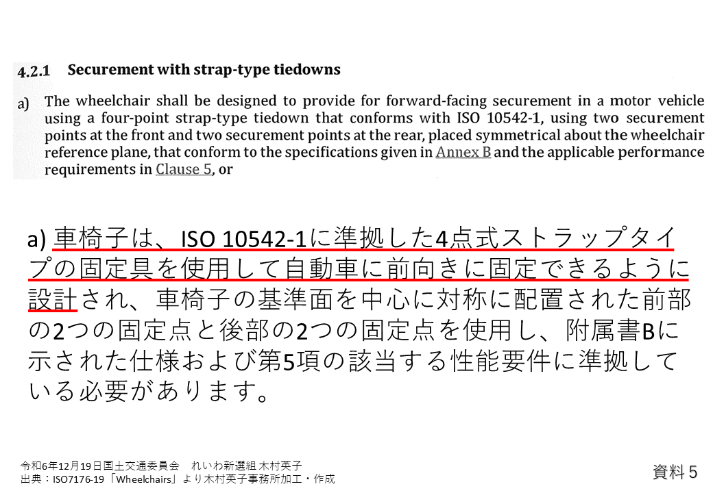 国際基準を定めているISO規格では、自動車に車いすの人が乗る場合、4点式ストラップタイプの固定具を使用して固定できるように設計されていることが必要であると提起されています。