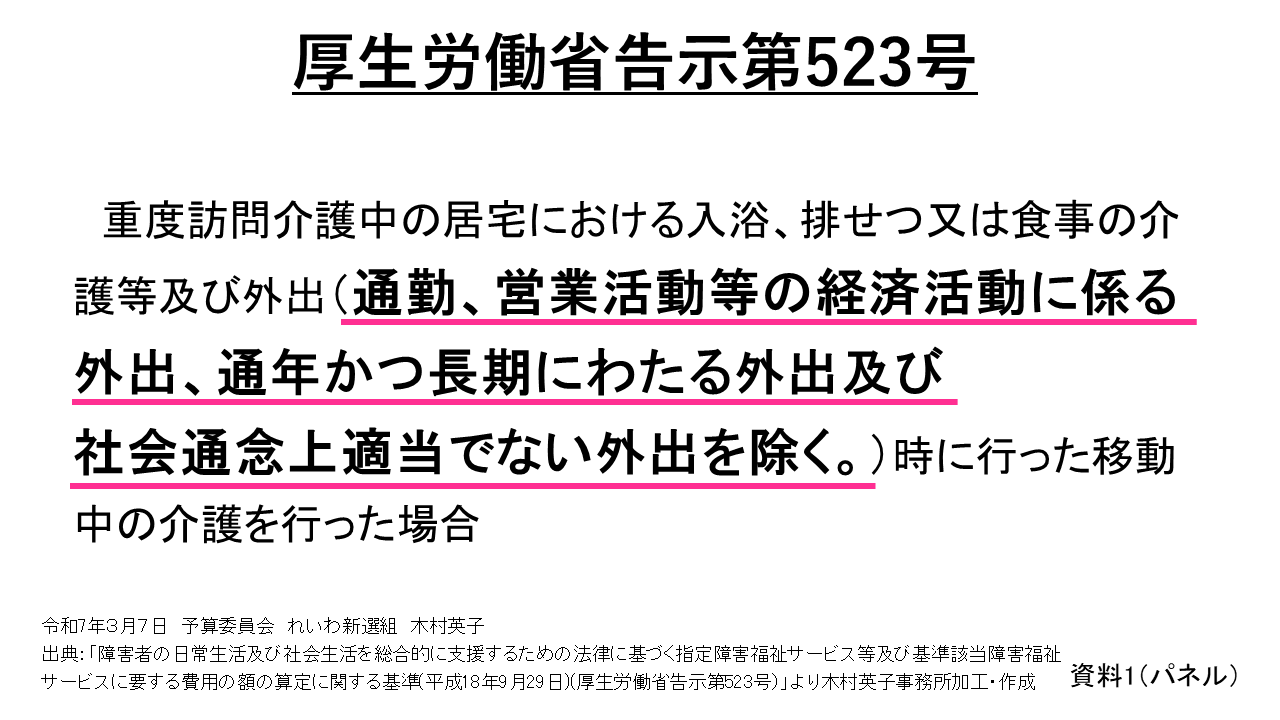 それは、このパネルに書かれている厚労省の告示523号の「通勤、営業活動等の経済活動に係る外出、通年かつ長期にわたる外出及び社会通念上適当でない外出を除く。」という文言によって障害者の社会参加に必要な外出が制限されているからです。