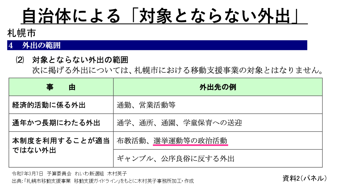 例えばこのパネルにあるように、札幌市では移動支援のガイドラインで選挙運動等の政治活動を禁止していますが、ほとんどの自治体が重度訪問介護にも同じ運用を適用しています。ですから、この告示が撤廃されない限り、私たち介護の必要な障害者は、行政から介護派遣を打ち切られ、命の危険に脅かされながらも選挙に出るか、それとも命を守るために選挙に出ることを諦めるか、その二者択一しかない状況です。