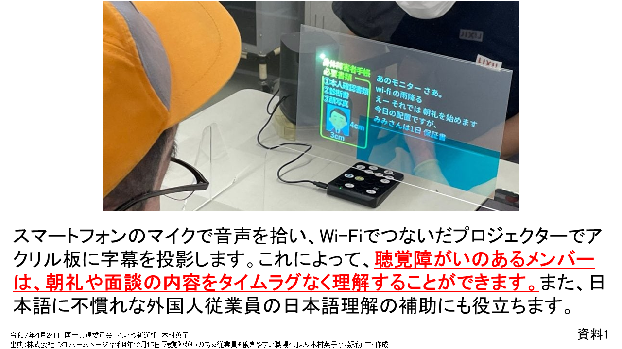 資料1のように、聴覚障害者の方が、スマートフォンのマイク音声を拾いWiFiでつないだ機器に表示するシステムを活用して労働環境を整備している事例もあり、障害者の方が働きやすい環境づくりにもインターネットの環境は欠かせないものとなっています。