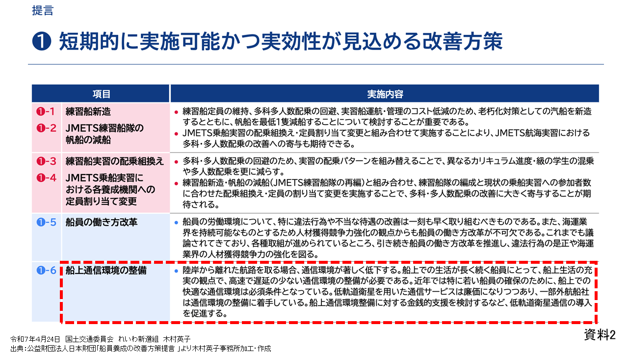 資料2にあるように、2024年に日本財団が取りまとめた船員養成の改善方策提言において、船上通信環境の整備について、インターネットなどの環境整備のための財政的支援が必要だと提言されています。