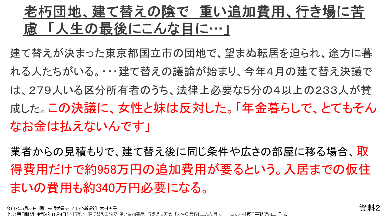 今回の改正案の検討会である法制審議会の部会においても、身寄りのない高齢者や障害者などの住宅弱者への配慮を求める意見が出されていましたが、このマンションの建て替えが進めば住宅の確保ができない人が増えてしまうおそれがあります。様々な事情を抱えた人がいますので、建て替えに反対した人が住まいの権利を保障するためにも、建て替えによって出ていかざるを得ない人たちが安心して住める公営住宅を増やしたり家賃補助を出すなど、国からの個別支援を考えるべきだと思いますが、国交省のお考えをお聞かせください。