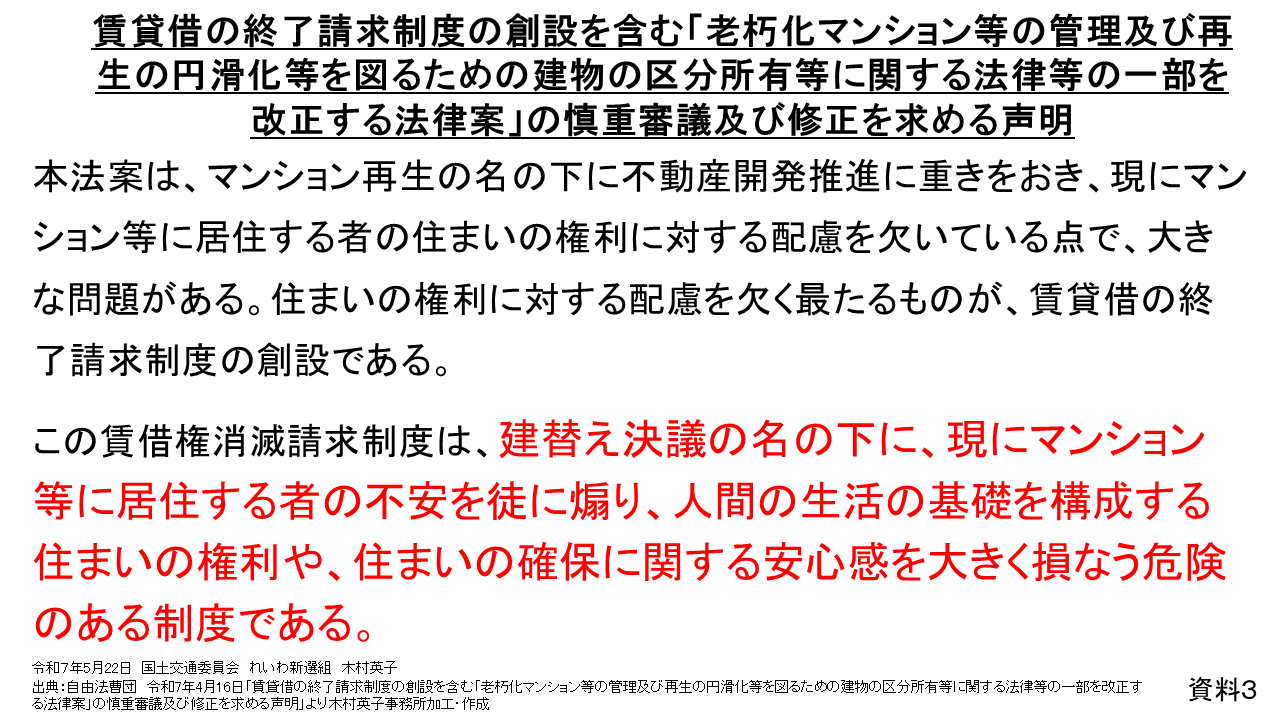 また、日本には、建物を借りている人の住まいの権利を守るために、借地借家法という法律があります。しかし、今回の改正で賃貸借終了請求制度が創設されると、建て替えの場合に正当な事由なくても契約を一方的に終了させることができるようになり、建物を借りている人の住まいの権利が守られなくなるおそれがあります。
