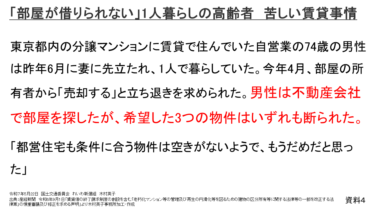 また、独り暮らしの高齢者の方の場合も賃貸住宅への入居も困難が多くて、資料4のとおり、