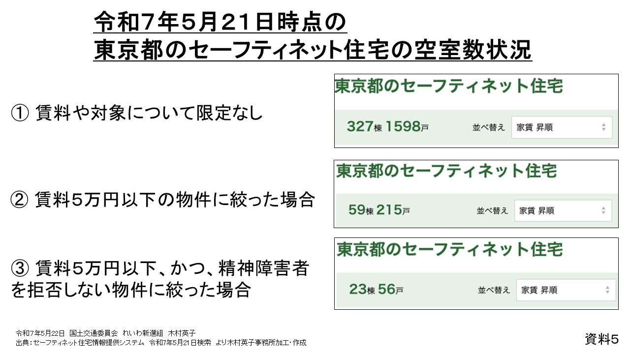 5月21日時点で、東京都のセーフティーネット住宅の空き家は327棟1598戸の登録がありますけれども、5万円以下の物件は59棟215戸しかなく、精神障害者を拒否しないと言っているのは23棟56戸しかありません。