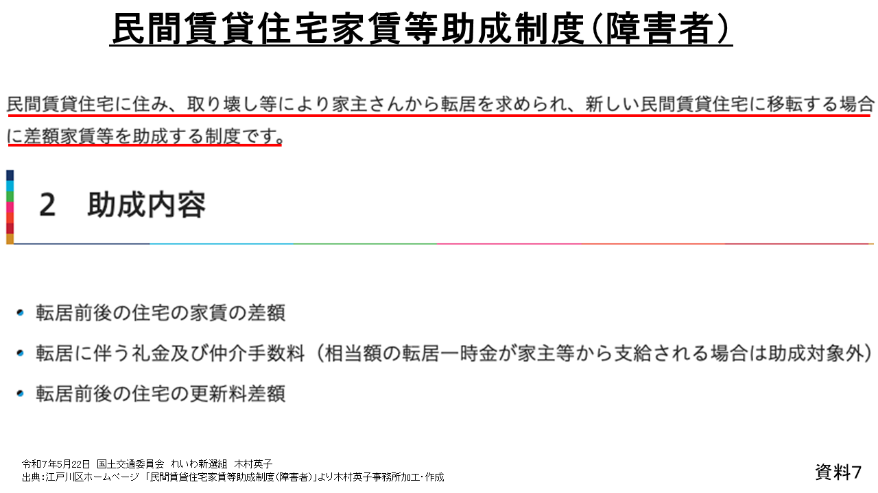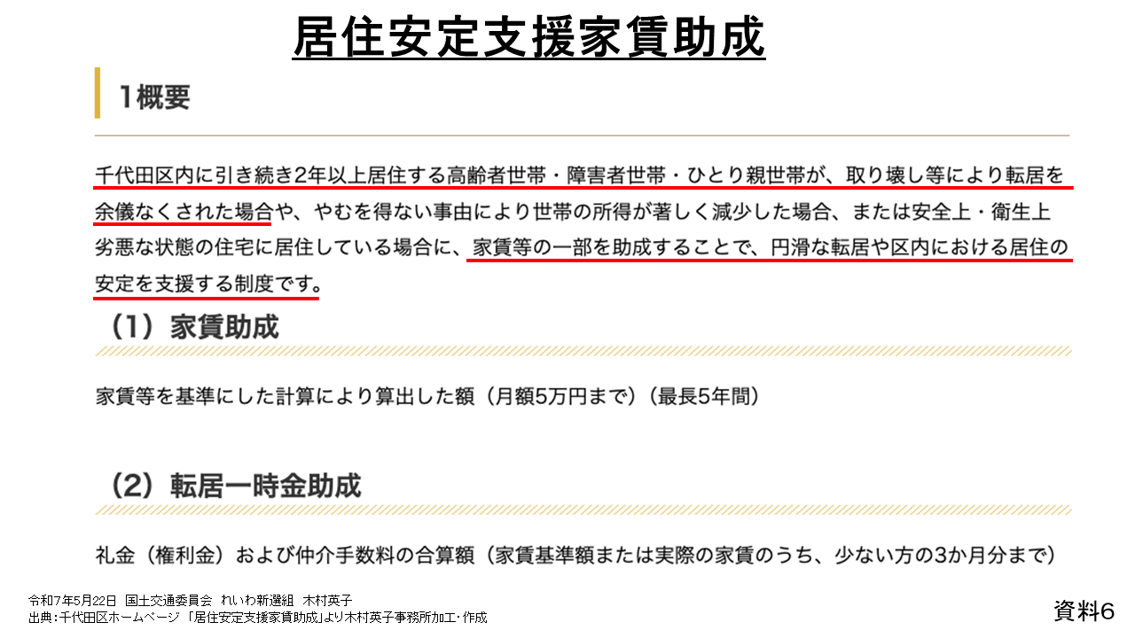 東京都千代田区では、千代田区内に2年以上居住している高齢者や障害者の方が住んでいる賃貸住宅が取壊しなどで退去しなければならない場合に、月額5万円まで、最長5年間の家賃助成や、礼金などを支払うための転居一時金の助成をする居住安定支援家賃助成という補助事業をつくっています。また、資料7のとおり、