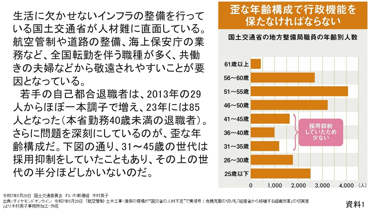 資料1では、生活に欠かせないインフラの整備を行っている国土交通省が人材難に直面しており、特に30代と40代の職員について、政府の方針により2011年度から国家公務員の新規採用者数を6割程度に抑制してきたことで職員不足が深刻となっていることが分かります。