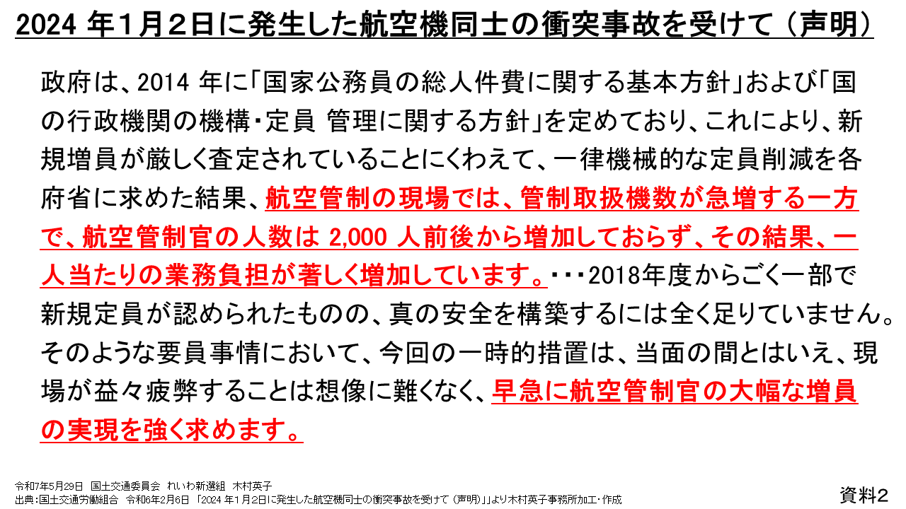 国交省は、航空管制官については近年定員を増やしていると言っていますが、資料2のとおり、国土交通労働組合は、昨年2月に出した声明の中で、2014年の国家公務員の総人件費に関する基本方針などにより、航空管制の現場では管制取扱機数が急増する一方で、航空管制官の人数は2000人前後から増加しておらず、その結果、一人当たりの業務負担が著しく増加しています。