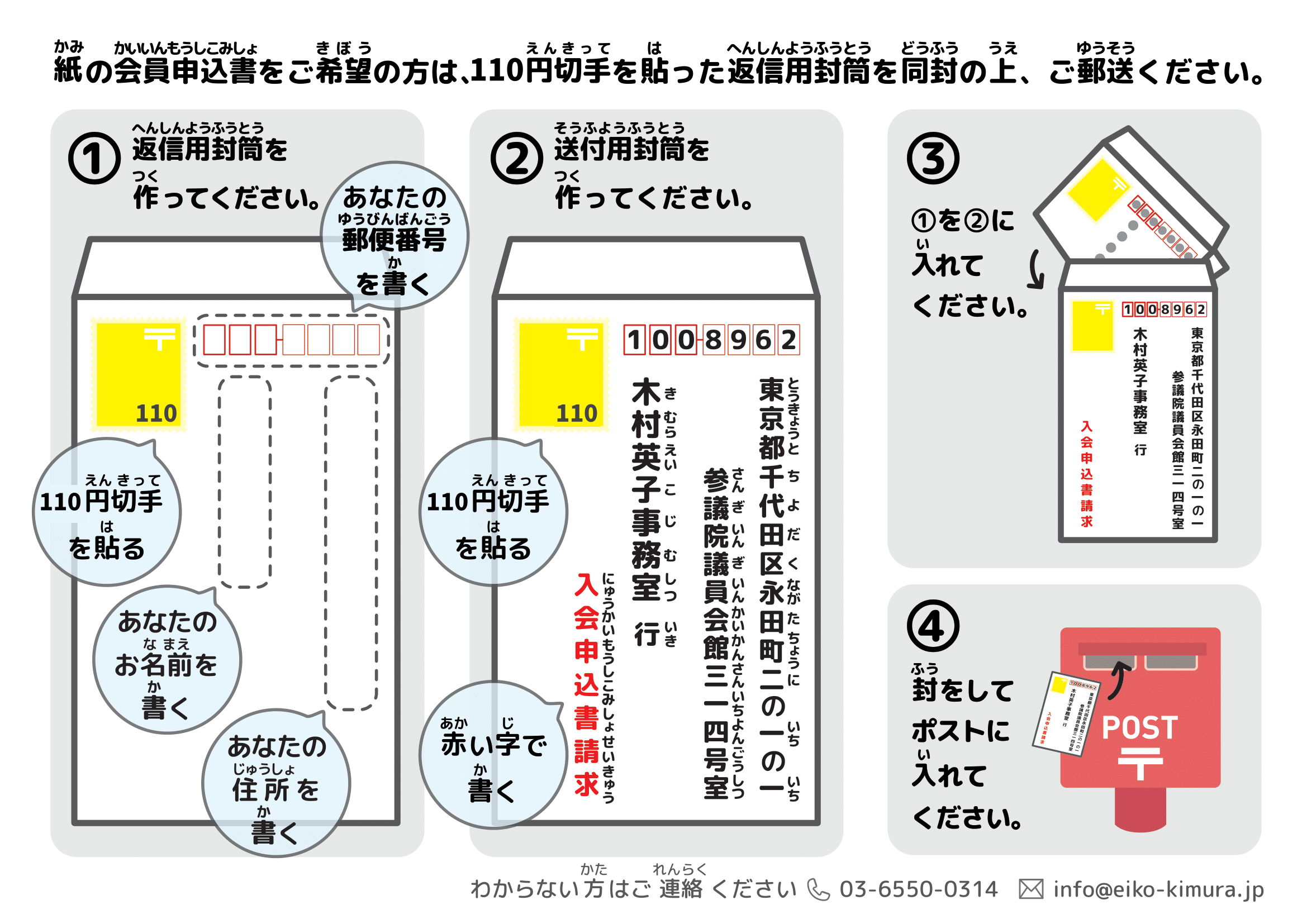 紙の入会申込用紙をご希望の方は、110円切手を貼った返信用封筒を同封し、郵送してください。